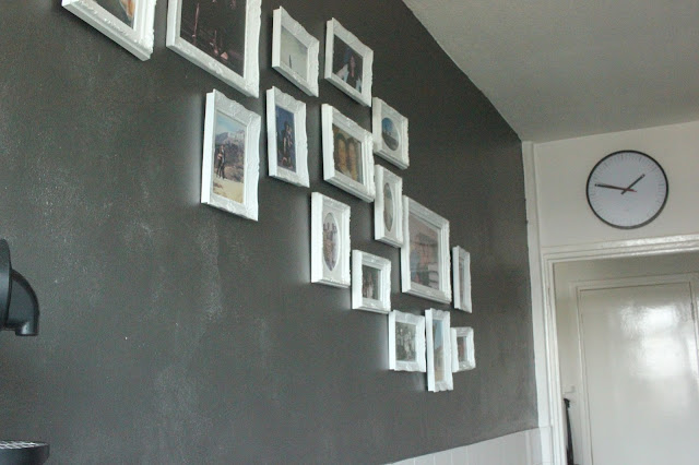 After four years I was done with this look. I wanted everything to be on one line in my whole apartment. Just like we did in the living room, we painted our memory wall in the kitchen white. We replaced our little kitschy picture frames with the three minimal big frames from IKEA .